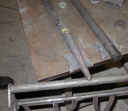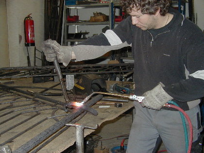 Christian Utzmeier erhitzt das Endstück mit dem Schweißbrenner, um es dann in glühendem Zustand in die endgültige Form zu biegen. (Mittwoch, 25. Februar 2004)