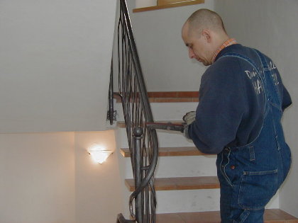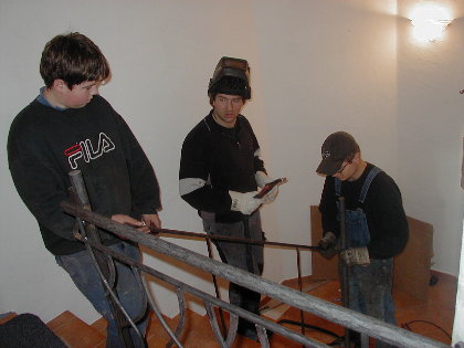 Hans Pertl bearbeitet die letzte Schweißstelle am Handlauf, die wegen einer kurzfristig "vor Ort" durchgeführten Umgestaltung des Handlaufabschlussess nötig wurde.
