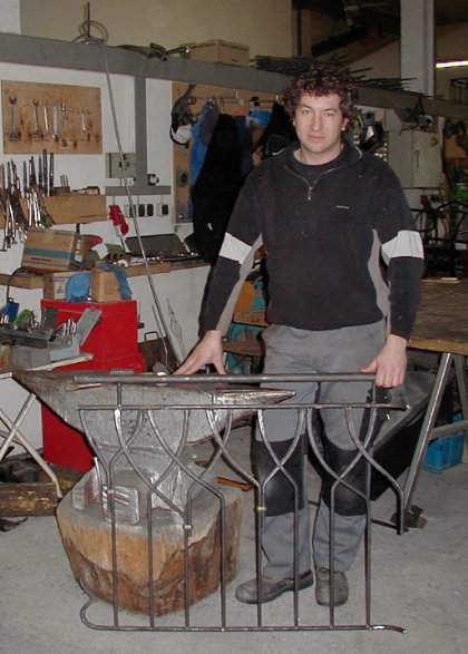 In der Bergener Werkstatt werden die vorgeschmiedeten Füllstäbe optisch "ansprechend" zusammensortiert. Eine ziemlich knifflige Arbeit, da dabei auch auf die gesetzliche Vorschrift geachtet werden muss, wonach aus Sicherheitsgründen ein maximaler Stababstand von 12 cm nicht überschritten werden darf. (Dienstag, 10. Februar 2004) |