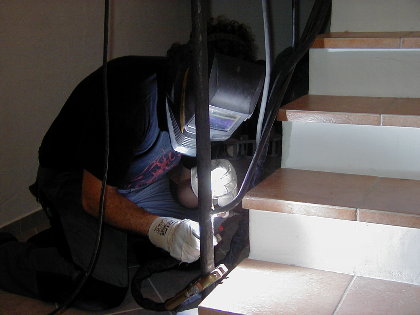 | Der fertige "Rahmen", der wieder zerlegt und in der Bergener Werkstatt mit Stäben gefüllt wird und für den jetzt auch passgenau der Handlauf geschmiedet werden kann. | Der Meister bei der letzten Schweißsarbeit am Fusse der Kellertreppe. |